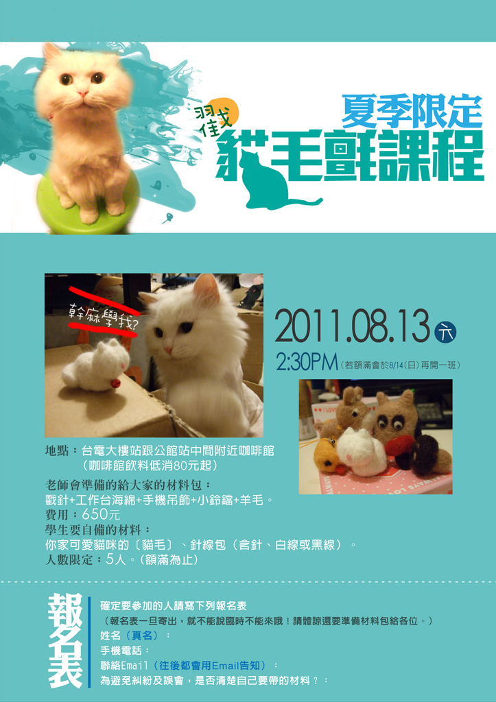 (報名表一旦寄出,就不能說臨時不能來哦!請體諒還要準備材料包給各位。)